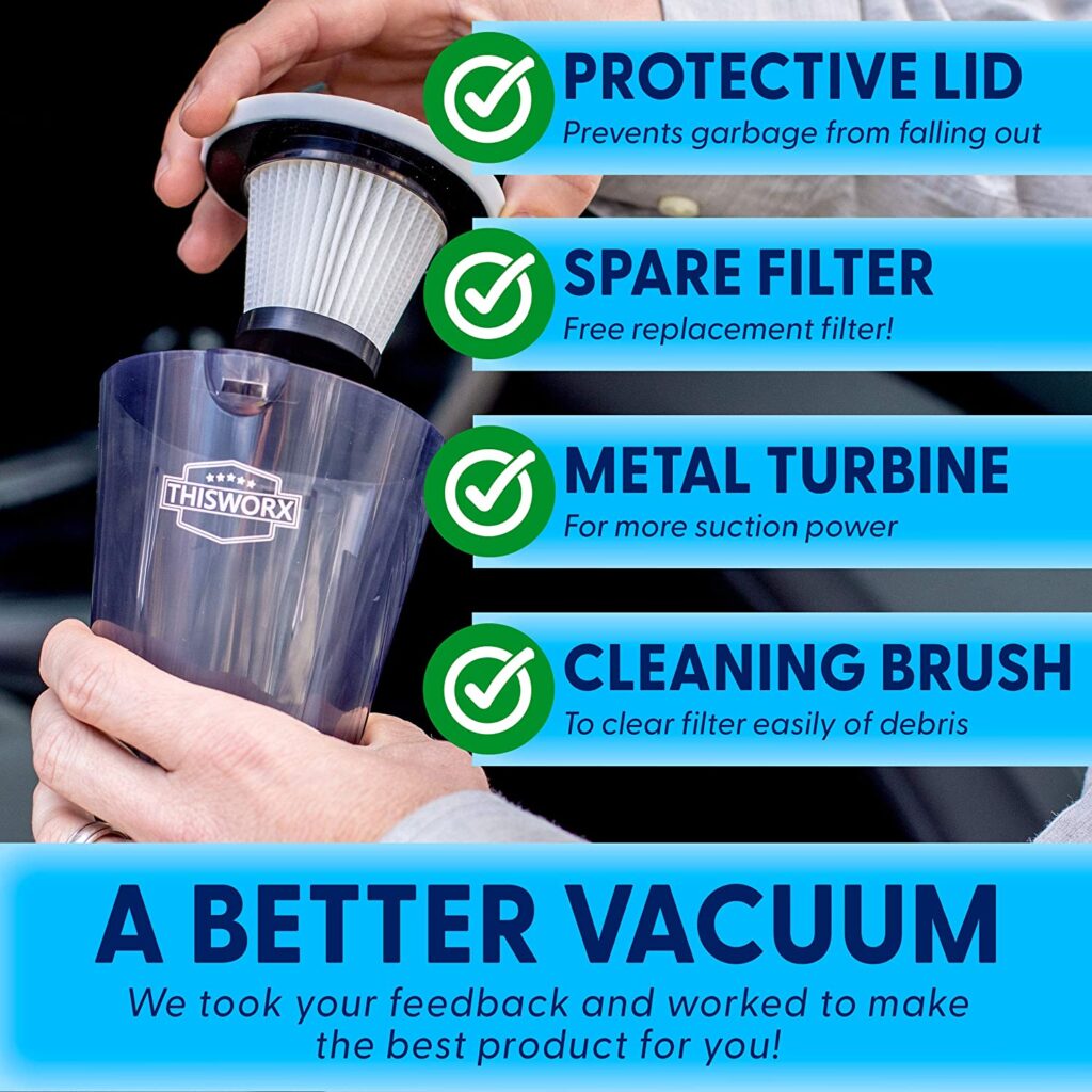 KEEP YOUR CAR PROFESSIONAL LEVEL CLEAN! No more crumbs, dust or dirt! With our ThisWorx Portable Car Vacuum Cleaner you’ll be free of any wet or dry messes, even liquids, cigarette ashes or pet hair